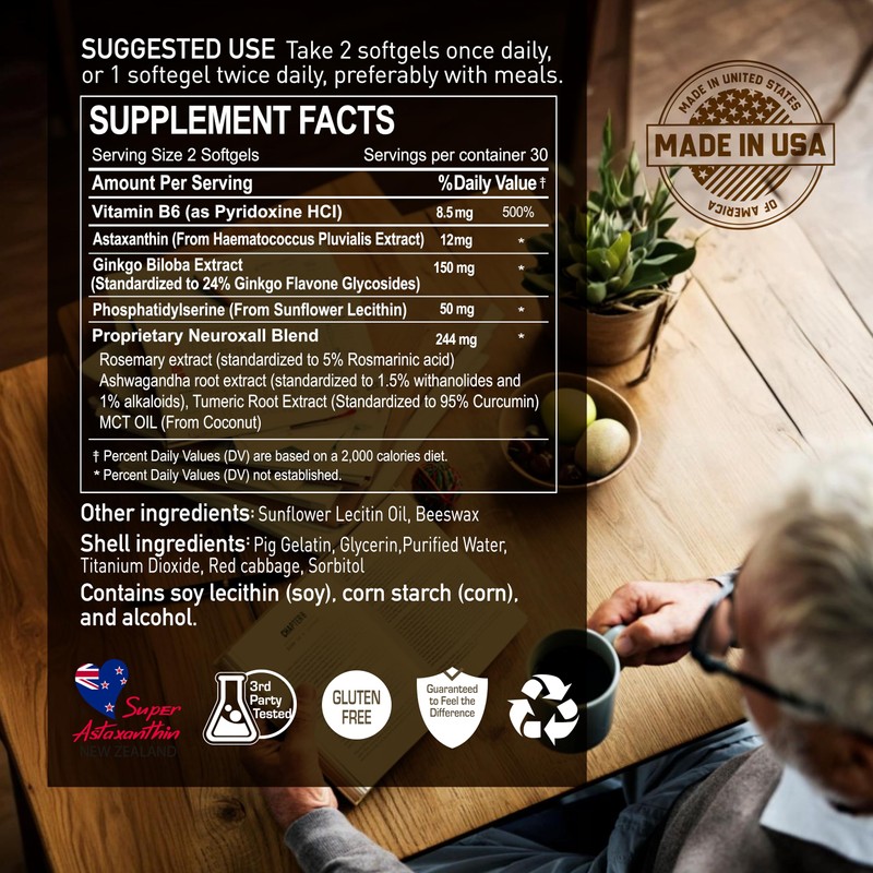 - Astaxanthin, another remarkable component of this formula, has been scientifically shown to have brain-boosting properties. It supports overall brain health and function, helping you stay focused, alert, and mentally sharp throughout the day.