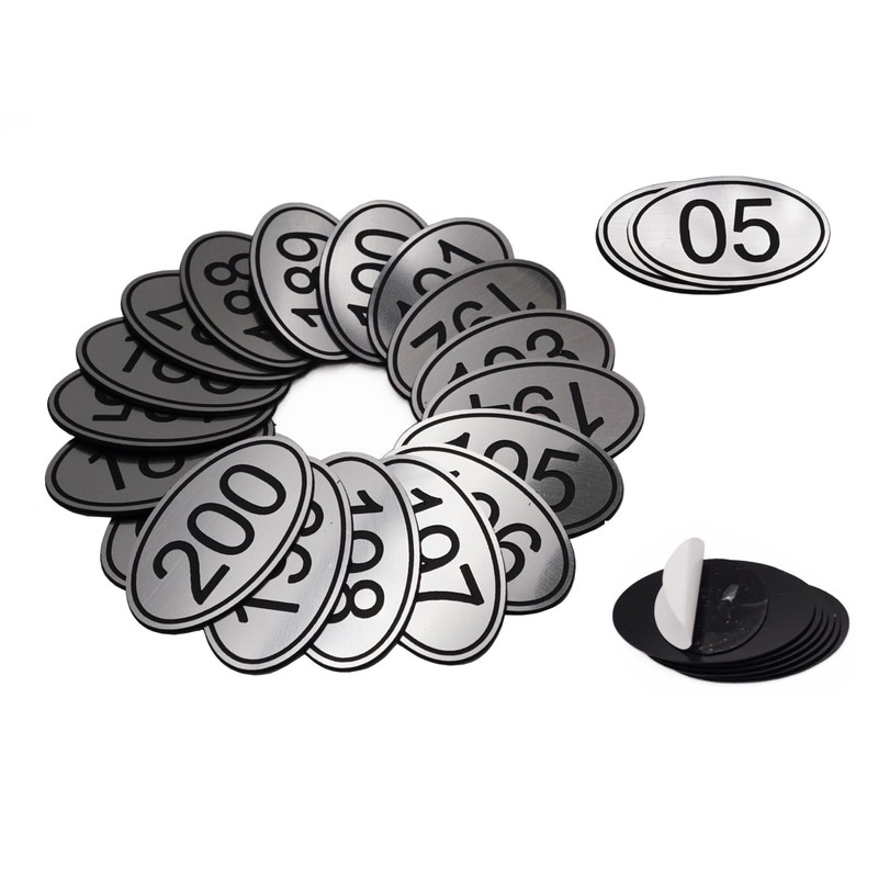 NanTun 100 Sets ABS Engraved Silver Oval Table Numbers Locker Tags with Double-Sided Tape - 1 to 100