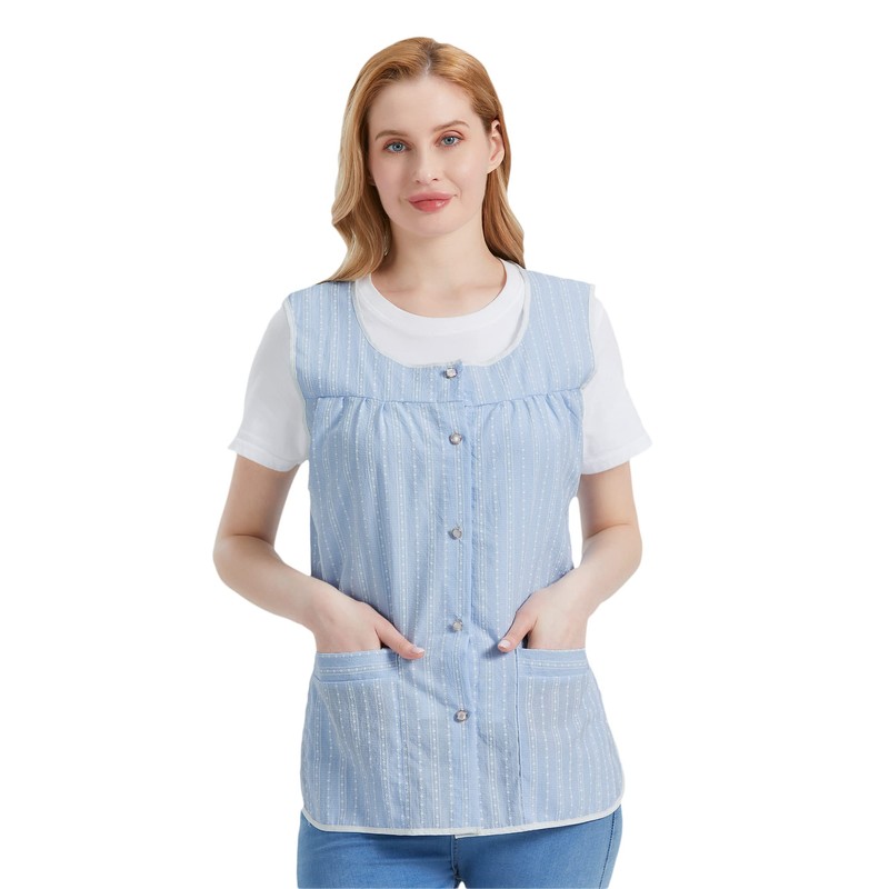 - LOOSE DESIGN: This sleeveless work apron has a beautifully snap buckle design and a large round neckline, very comfortable in summer,suitable for most ladies and girls.Not the U.S. standard size, please look carefully at the size chart, the clothes size is small, please choose a size larger.