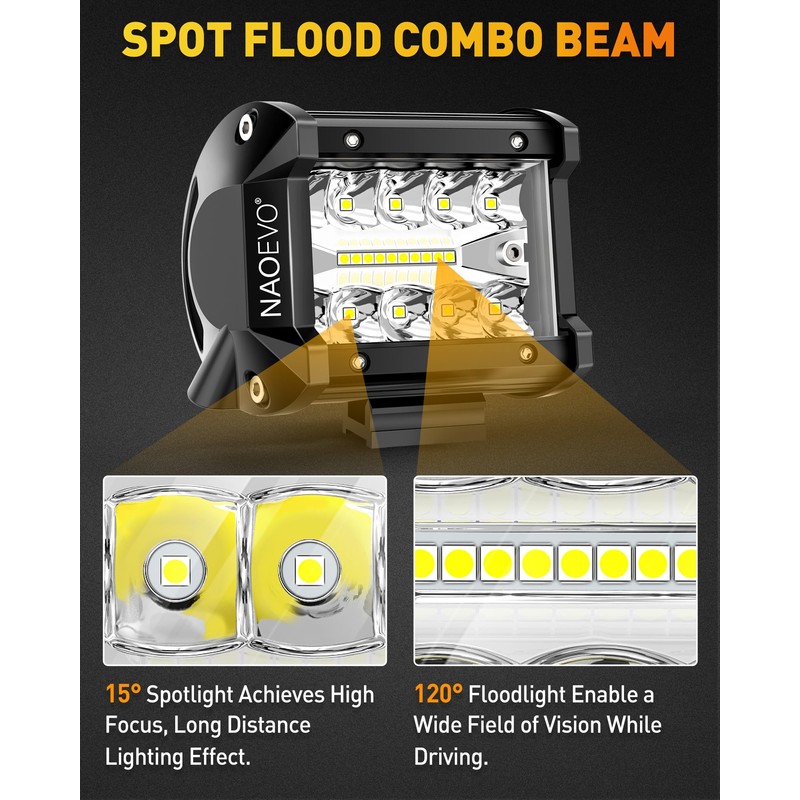 - [Spot Flood Combo LED Light Pods] - NAOEVO 4 inch LED pods feature 15 spotlight beam to provide high-focus, long-range visibility, while the 120 floodlight beam provides broader coverage. Furthermore, a 45 adjustable bracket for flexible repositioning to change beam direction. The combo is ideal as off road/driving lights, as you need to see both ahead and around you while driving.