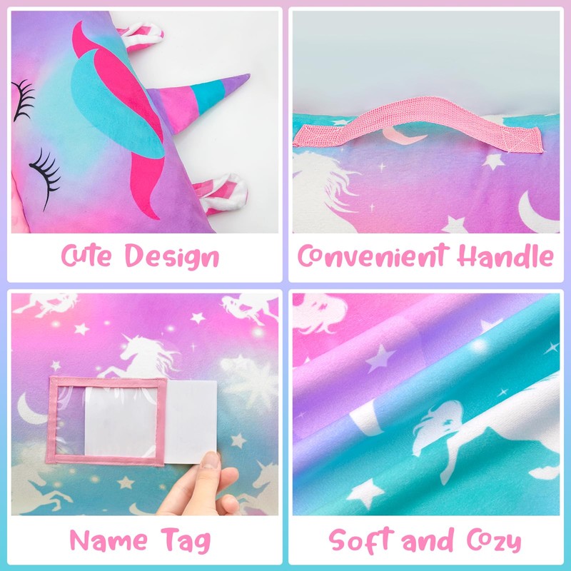 - Designed with funny unicorns printing and 3D unicorn pillow with horn and ears, this unicorn sleep bag is very suitable for decorating room and add more fun while sleeping