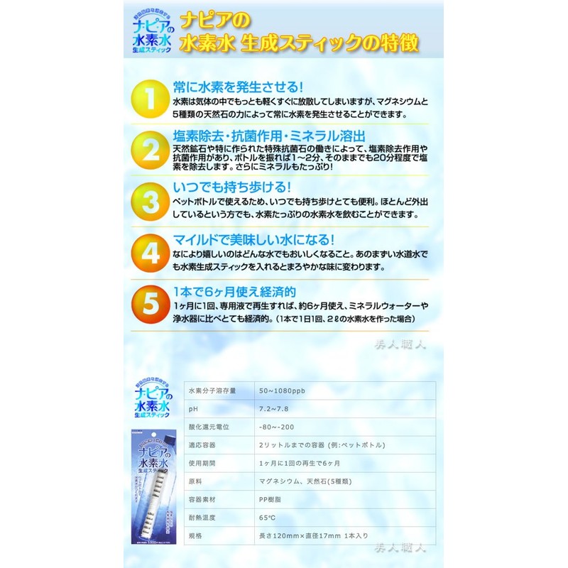- napia to produce hydrogen water stick comes in a 2 oz. bottles per pack of 1, 1 in at a ratio of one, 20 minutes with stick to the hydrogen water "and" napia Giclee. Magnesium stone, Obsidian, weathered 麦飯 stones, coral, tourmaline, anti-bacterial, the formula on the market.
