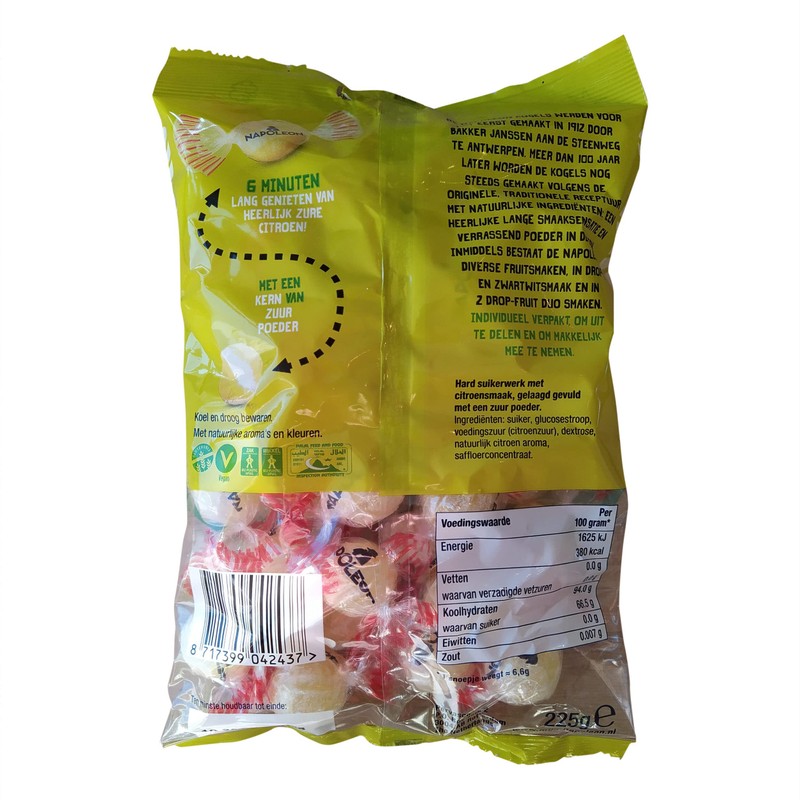 Napoleon Candy is traditionally made in The Netherlands with natural ingredients since 1912. The fruity sour Napoleon candies have fizzy powder inside. This bag of Napoleon Lemon Candy contains fruit candies with a sour lemon flavor. Buy Now!