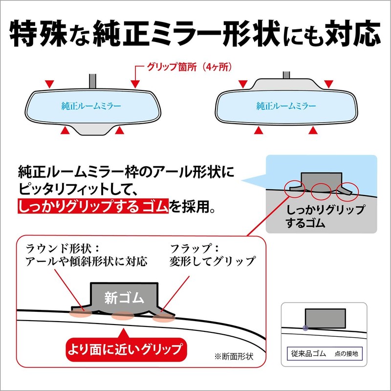 - New Grip Method : Uses rubber that fits perfectly to the rounded shape of the OEM mirror frame and grips firmly.