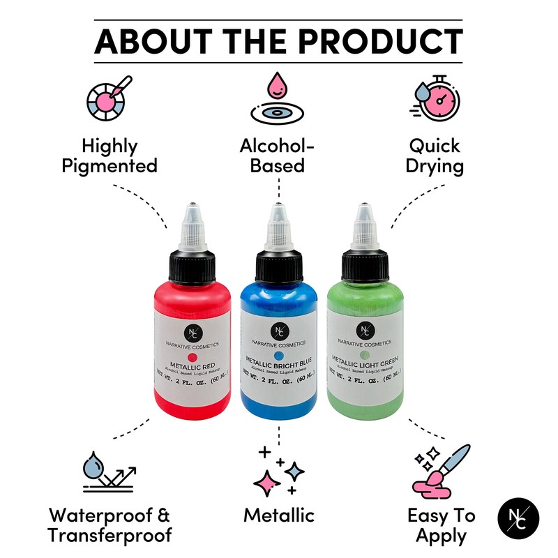 - Richly Pigmented Colors: 13 metallic shades for vibrant, eye-catching designs in bodypainting, film, TV, and cosplay. Colors include: Metallic Black, White, Silver, Red, Yellow, Bright Blue, Green, Pink, Purple, Blue, Light Green, Gold, Bronze.