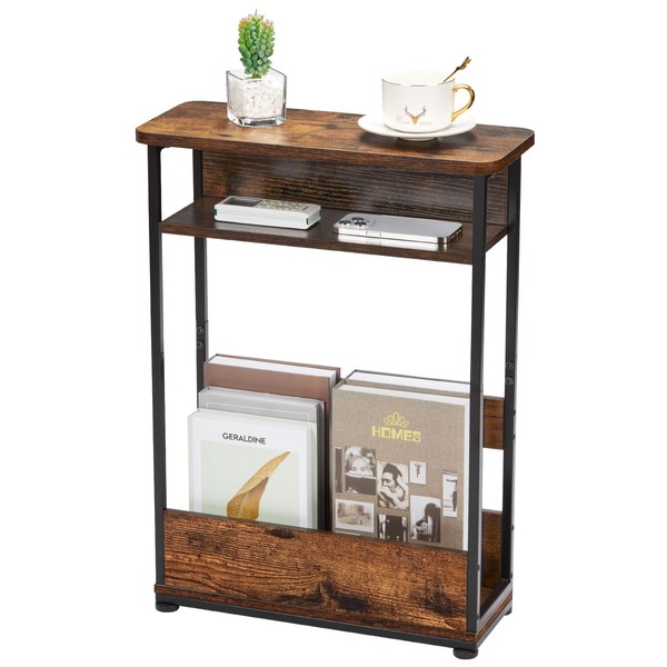 Narrow Side Table,3-Tier Slim End Table with Storage Shelf,Modern Sofa Table Thin Side Table for Narrow and Small Spaces, Skinny Bedside Table Small Nightstand with Magazine Rack Space Saving/Brown