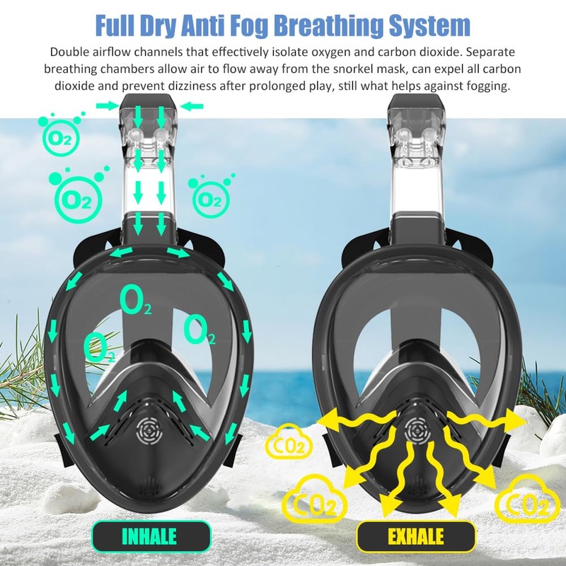 - 🌊【Full Dry Anti Fog Breathing System】 Our full face snorkel mask adopt double airflow channels that effectively isolate oxygen and carbon dioxide. Separate breathing chambers allow air to flow away from the snorkel mask, can expel all carbon dioxide and prevent dizziness after prolonged play, still what helps against fogging, is scratch resistant, Enjoy a crystal clear view of the experience and it allows you to snorkel longer.