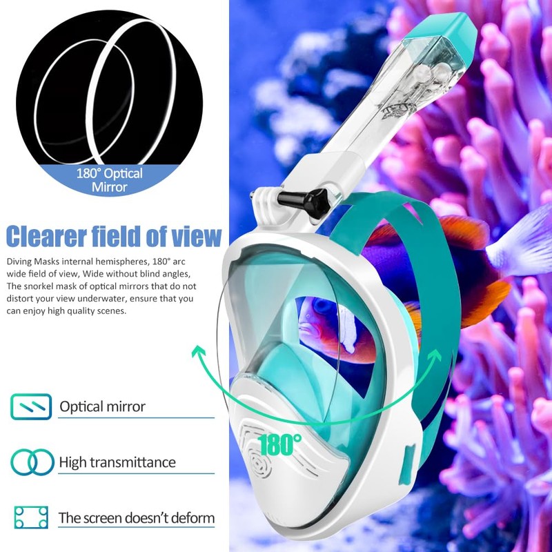- 🐳【Panoramic View And Support Camera Assembly】 Our snorkel mask can provide a 180°snorkeling experience with no blind spots, allowing a really wide and clear 180°view underwater. So you won't miss the lovely fish and sea creatures that are not directly in front of you. This snorkel mask set is compatible with sports camera mounts, with the removable motion camera mount that allows you to capture every wonderful moment in the sea and share it with your friends.
