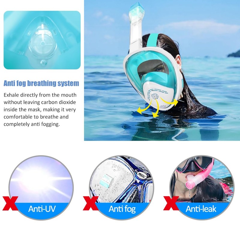 - 🌊【Full Dry Anti Fog Breathing System】 Our full face snorkel mask adopt double airflow channels that effectively isolate oxygen and carbon dioxide. Separate breathing chambers allow air to flow away from the snorkel mask, can expel all carbon dioxide and prevent dizziness after prolonged play, still what helps against fogging, is scratch resistant, Enjoy a crystal clear view of the experience and it allows you to snorkel longer.