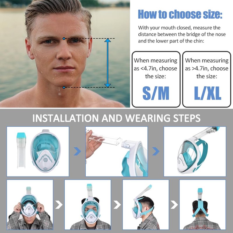 - 👫【Two Size Can Be Choose】 Our full face diving masks are available in sizes S/M and L/XL. Suitable for men, women and children Over seven years old. The diving mask can be easily disassembled, and in a carrying bag, which is not only portable, but also beautiful and convenience. It is the best choice as a gift for your friends and famalies this summer. Measure the distance from the bridge of the nose to the chin before buying, if less than 4.7 inches choose S/M; if over 4.7 inches choose L/XL.