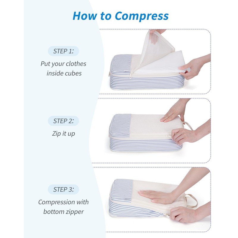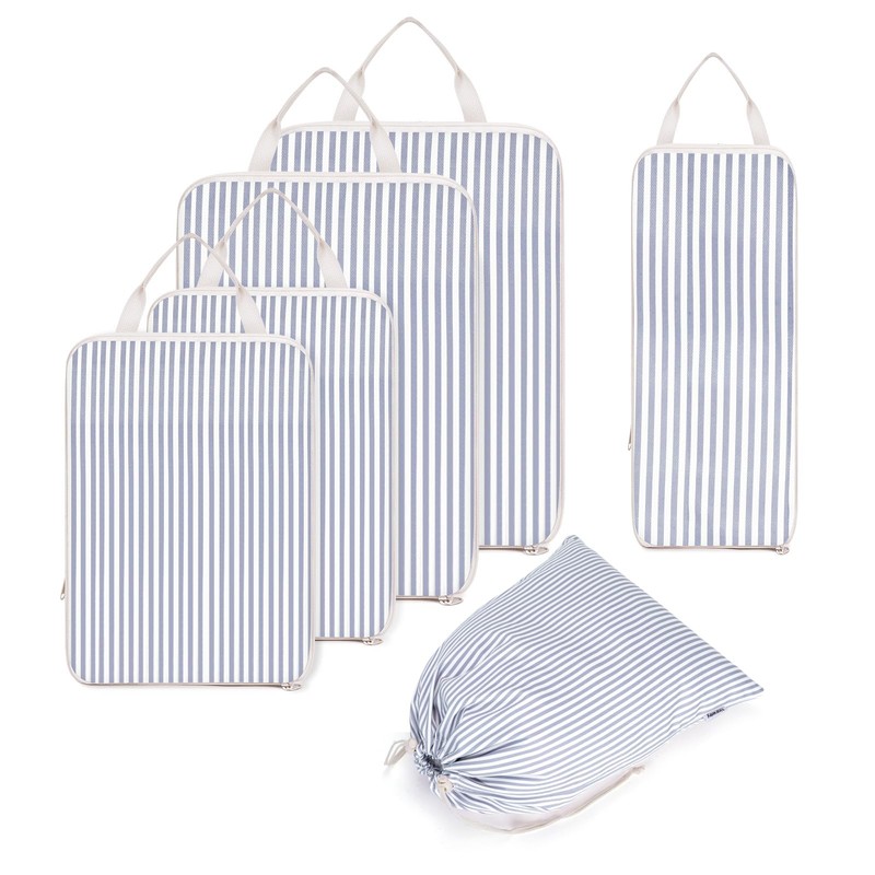 Narwey 6 Set Compression Packing Cubes for Suitcases and Backpack, Travel Organiser Packing Bags for Carry on Hand Luggage Travel Essentials Bag (Greyish Blue Stripe)
