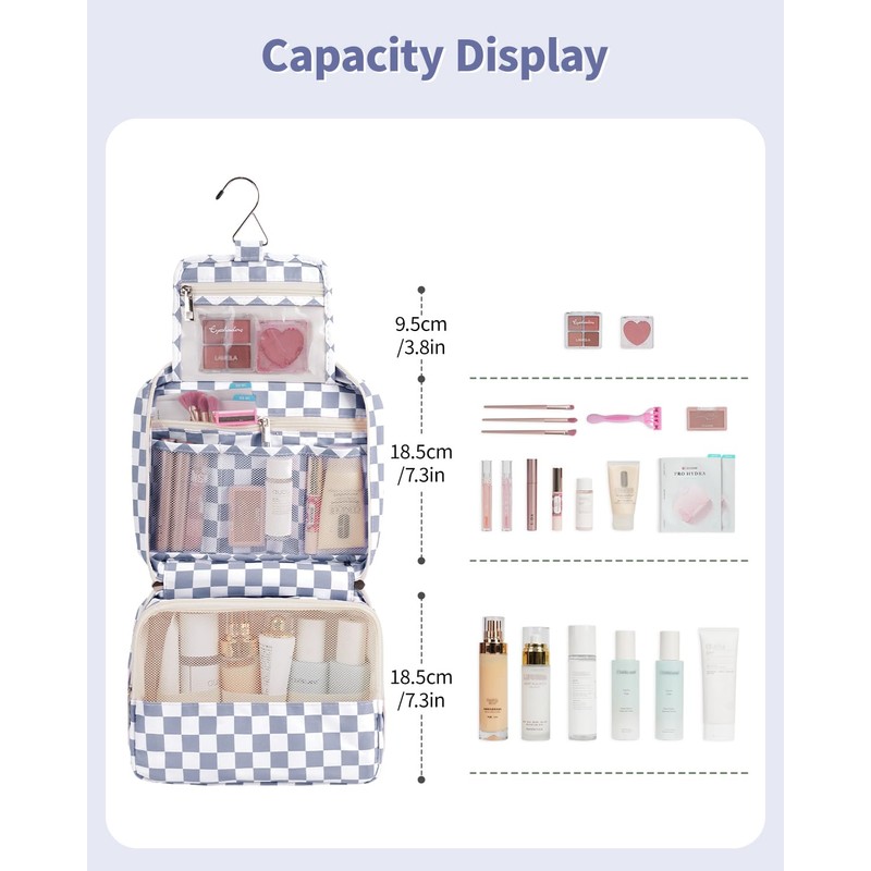Narwey Checkered Hanging Toiletry Bag Women Travel Toiletries Bag Cosmetic Makeup Bag Water-Resistant Organizer for Girls (Grayish Blue Checkerboard)