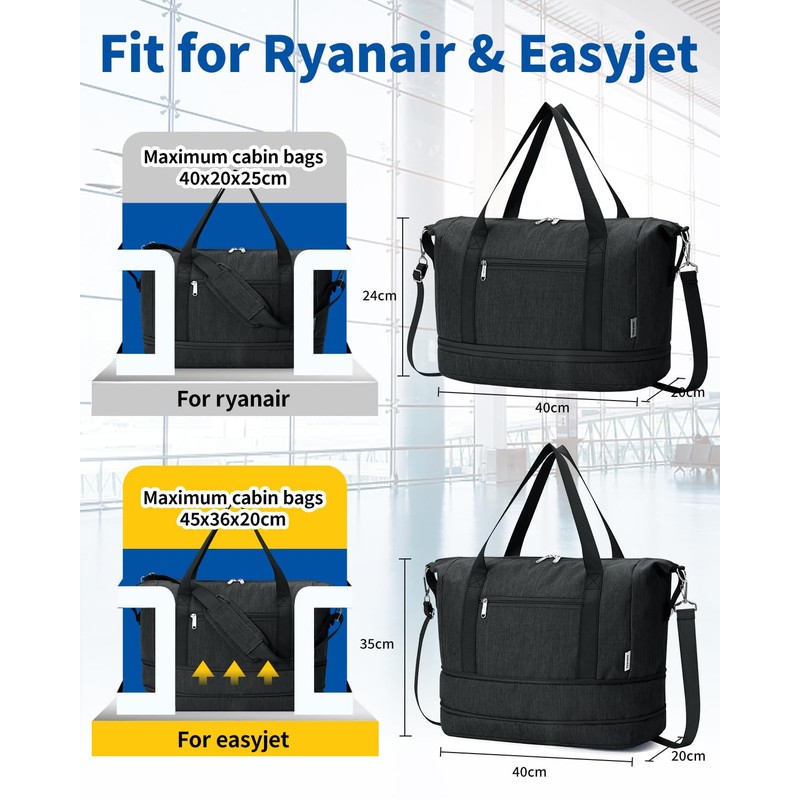 - Design for Ryanair & EasyJet - Bag size 40x20x24cm (20L) before expansion perfect fits small underseat cabin bag size 40x20x25cm of Ryanair Airlines; After expansion measures 40x20x35cm (28L) suitable for underseat cabin bag 45x20x36cm of Easyjet, which can be placed under seat and no need to pay for extra baggage