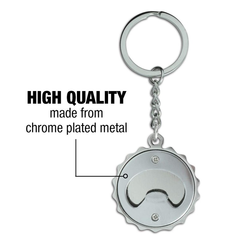- QUALITY MATERIAL: Our durable keychain is crafted from chrome plated metal with a glossy resin-topped featured design shown on top and bottle opener on back. The pop cap is 1.5" (3.8cm) in diameter, and the entire keychain is approximately 3.9" (9.9cm) x 1.5" (3.8cm) in size.