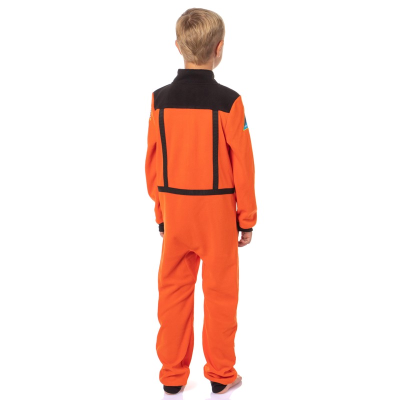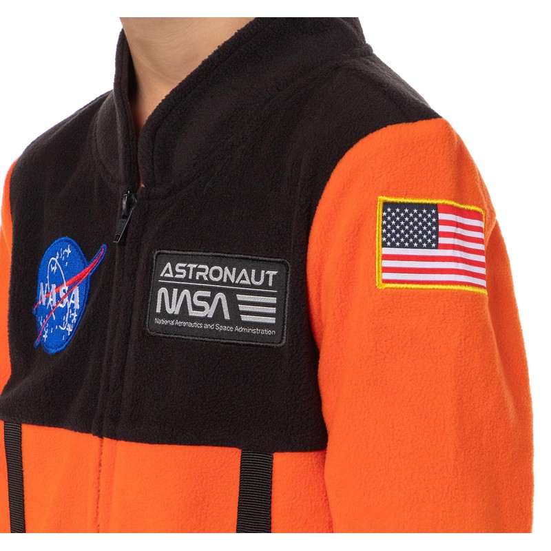 - Great Astronaut Design: Ignite your child's imagination with this authentic NASA Space Shuttle Astronaut Union Suit! Designed to resemble the astronaut suit, it features vibrant orange fleece with black accents, the NASA "meatball" logo patch on the chest, a Space Shuttle patch on the right arm, and a USA flag patch on the left arm. The realistic details make it excellent for pretend play, bedtime adventures, or even costume parties