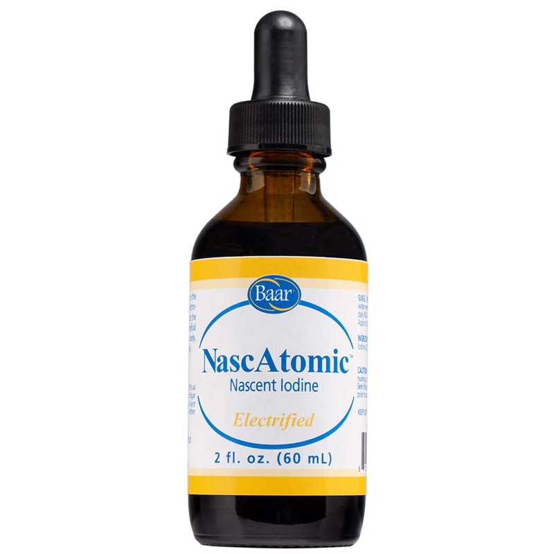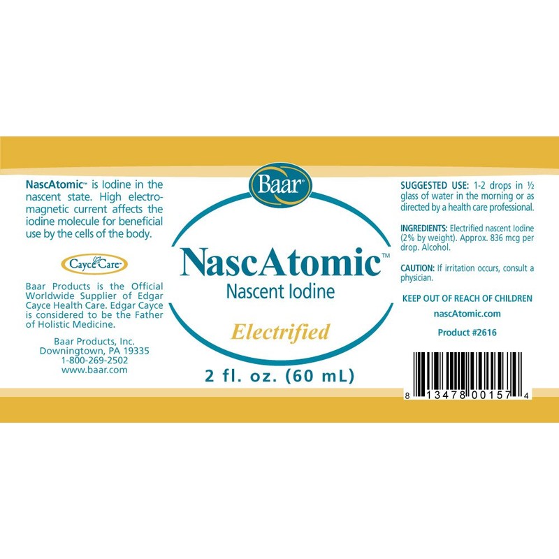 Baar Products has over 25 years of experience electrifying Iodine. The quality that separates NascAtomic from all other iodine products is that the diatomic bond is broken, liberating the Iodine element in an atomic or nascent state. This is done by the process of electrifying the solution which allows the Iodine atoms to each keep one of the two electrons that had made up the covalent bond. This is known as homolytic cleavage and creates an electromagnetic charge to the Iodine. That means your body is able to use it more efficiently. In this form, the body can readily assimilate and use the Iodine and convert it to be easily used by the body. The Iodine being in the atomic state was the reason it was called Atomidine or Atomic Iodine. Tested Free of Radio-Activity.