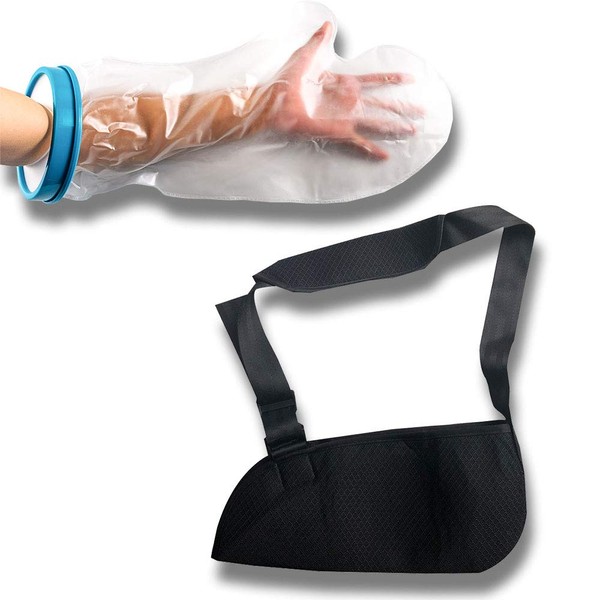 - 腕や手首の骨折・ケガをした際の固定具としてお使い頂ける肩掛け用アームホルダーと、シャワーや風呂への入浴時に包帯やギブスを濡らさないようにするための防水仕様のギプスカバーの2点セットです。