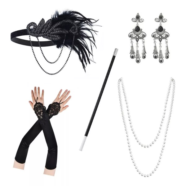 1 x diadema elástica con plumas; 1 x par de guante; 1 x par de pendientes colgantes de estilo retro; 1 x collar de perlas de imitación brillantes; 1 x pulsera de perlas de imitación brillantes; 1 x soporte para cigarrillos.