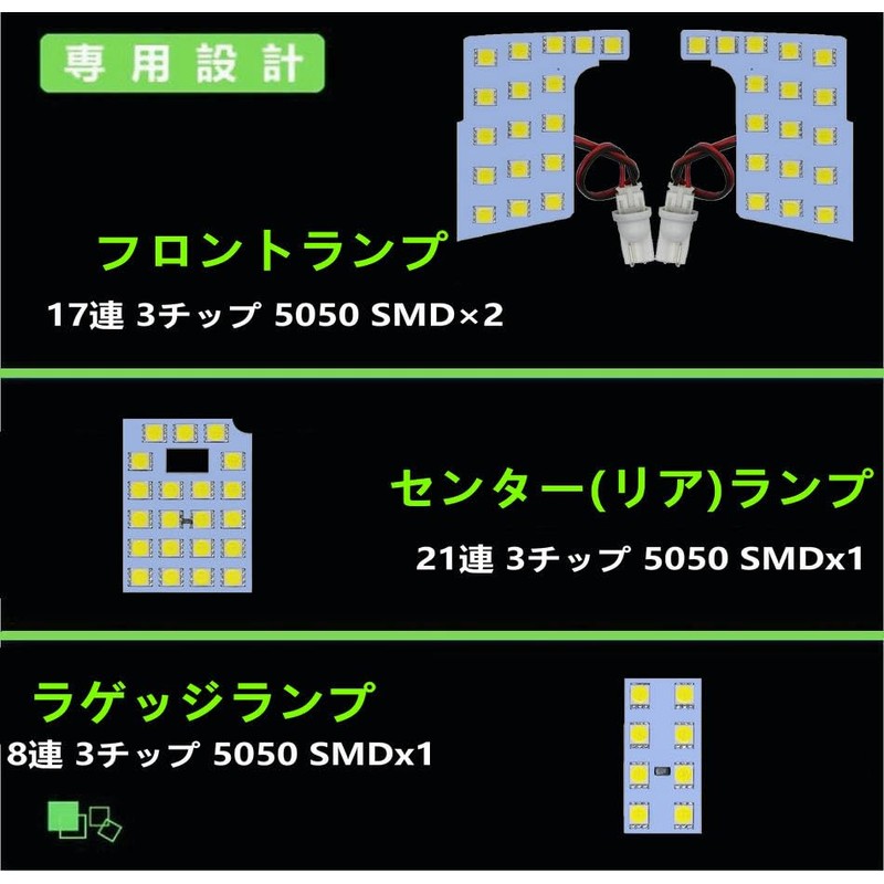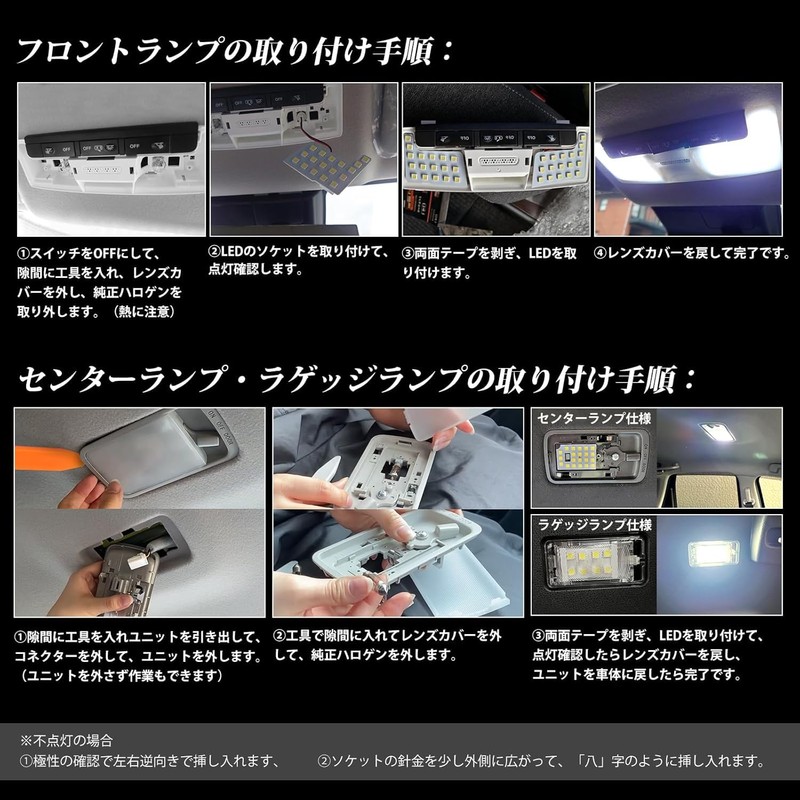 - ■Product Package Includes: Front Room Lamp 17-gang 3-chip 5050 SMD x 2, Center (rear) Room Lamp 21-gang 3-chip 5050 SMDx1, Luggage Lamp 8-row 3-chip 5050 SMD x1, Total 4-piece set, 63SMD 5050 chip. 1 x Upholstery Removal Tool Included, 1 x Instruction Manual
