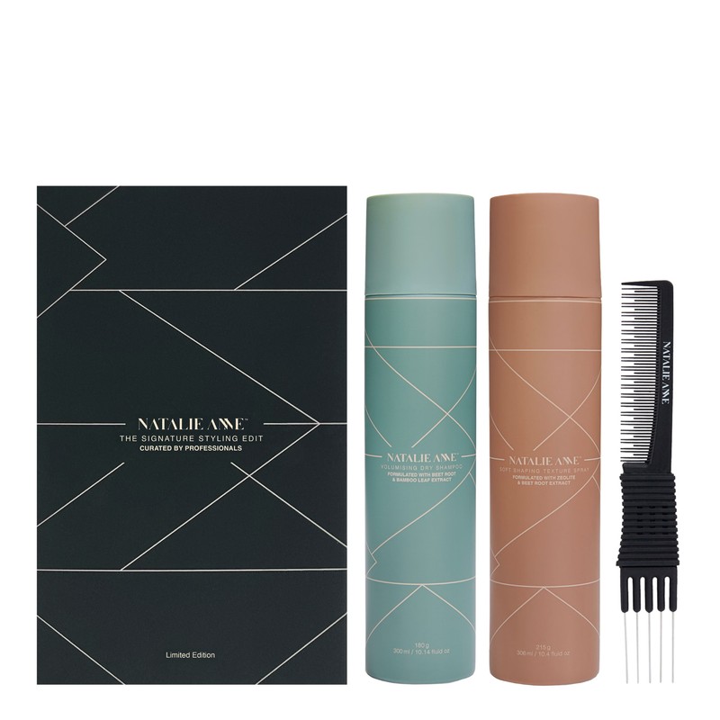 The Natalie Anne The Signature Styling Edition Pack is your ultimate solution for achieving salon-quality hair at home. This exclusive bundle is designed to elevate your hair styling routine with essential products that add volume, texture, and style. Whether you're looking to refresh your hair between washes or create a stunning textured look, this pack has everything you need. Crafted by hair expert Natalie Anne, each product in this collection is formulated to deliver professional results, making it a must-have for anyone seeking to enhance their hair's natural beauty. What is included in Natalie Anne The Signature Styling Edition Pack? • Natalie Anne Volumising Dry Shampoo 300ml • Natalie Anne Soft Shaping Texture Spray 306ml • Natalie Anne Volumising Comb (black) What are the features and benefits of Natalie Anne The Signature Styling Edition Pack? Natalie Anne Volumising Dry Shampoo: This dry shampoo is perfect for refreshing your hair between washes, absorbing excess oil, and adding instant volume without leaving any residue. It's ideal for those busy days when you need a quick hair pick-me-up. Natalie Anne Soft Shaping Texture Spray: Create effortlessly chic styles with this texture spray that adds body and definition to your hair. It's perfect for achieving that tousled, beachy look or adding structure to your updos. Natalie Anne Volumising Comb (black): This comb is designed to lift and volumize your hair, making it easy to achieve the perfect style. Its sleek black design adds a touch of elegance to your styling tools. Who is Natalie Anne The Signature Styling Edition Pack for? This pack is perfect for anyone looking to achieve professional-quality hair styling at home with ease.