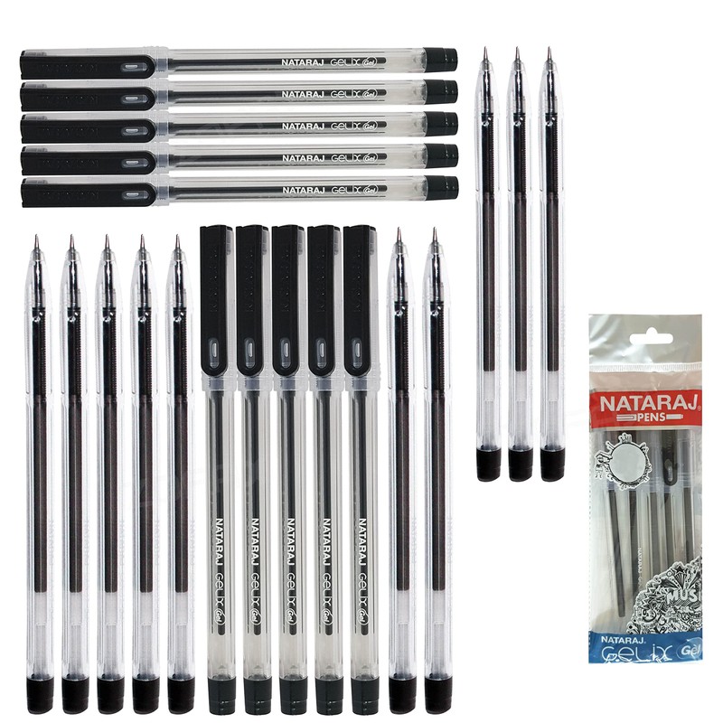 NATARAJ - 20 Gelix Gel BLACK Pens 0.7mm Fine Tip Waterproof Ink Office School