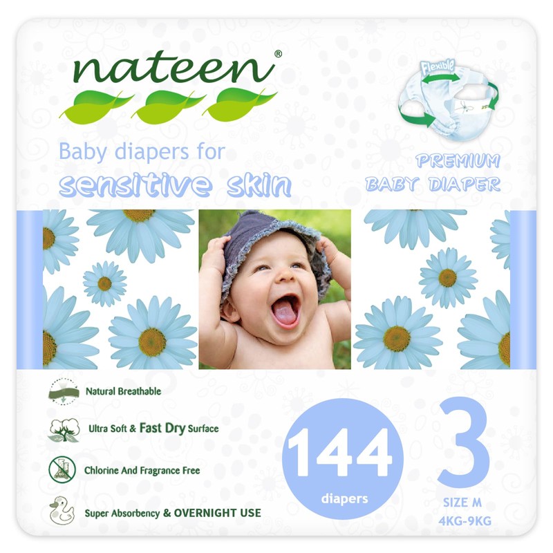Nateen Premium Baby Diapers, Overnight Use Disposable Diapers for Sensitive Skin, Ultra Thin Diapers with Comfortable Fit. (Size 3 (Medium), 144, Count), White