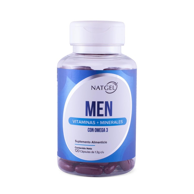 NATGEL presenta su suplemento integral Complemix MEN, una fórmula especialmente diseñada para hombres que combina vitaminas, minerales y Omega 3. Cada cápsula de 1.3g proporciona un apoyo nutricional completo para mantener la salud y el bienestar general.