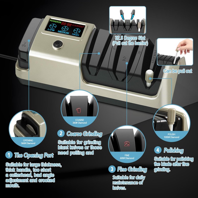 - đȘăFour-stages sharpeningă: Stages 1 and 2 are plated with 100% diamond 360 grit and 600 grit. Stage 3 is highest grade 1000 grit ceramic material to polish and help prolonging the life of serrated knives. The 4th stage is an open grinder. This grinder is for any type of knife; whether you have a machete, axe, or scissors.