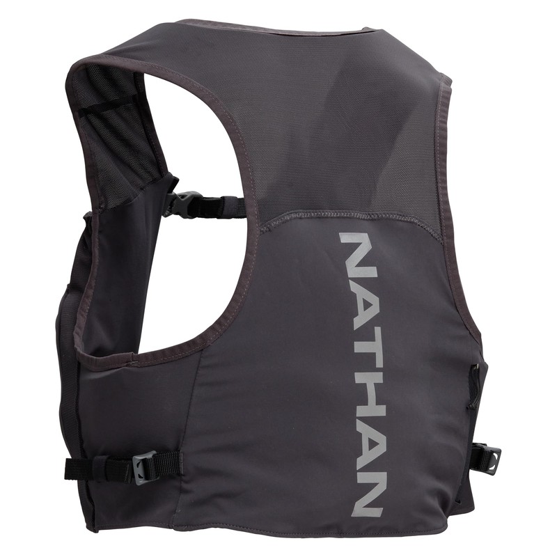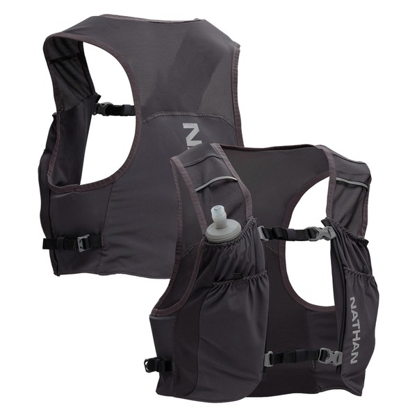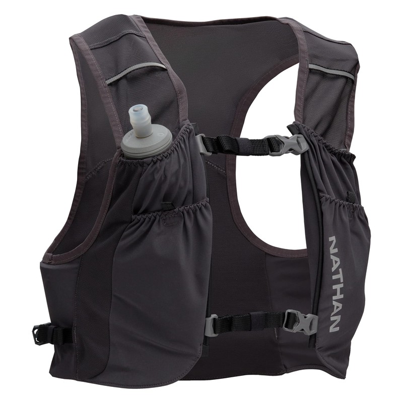 - Unisex, compression-fitted vest designed with a longer back for the ultimate fit and function,Shoulders and upper back are made of power mesh for maximum breathability and ultra-light adaptable comfort,Back pocket with 1.5L capacity and right entry zipper closure designed to store jacket, essentials and valuables.,4 Front pockets fit bottles and flasks up to 20oz,Vest comes with 14oz Nathan x Hydrapak Soft Flask with tapered bottom. Bounce-free run fit.