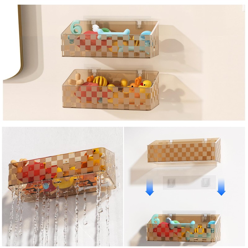 Strong adhesive strips ensure a secure wall mount that won't slip, while built-in drainage holes prevent water buildup for faster drying. Beyond toys, it's perfect for shampoo, soap, and shower accessories – the ultimate solution for a tidy, functional bathroom!