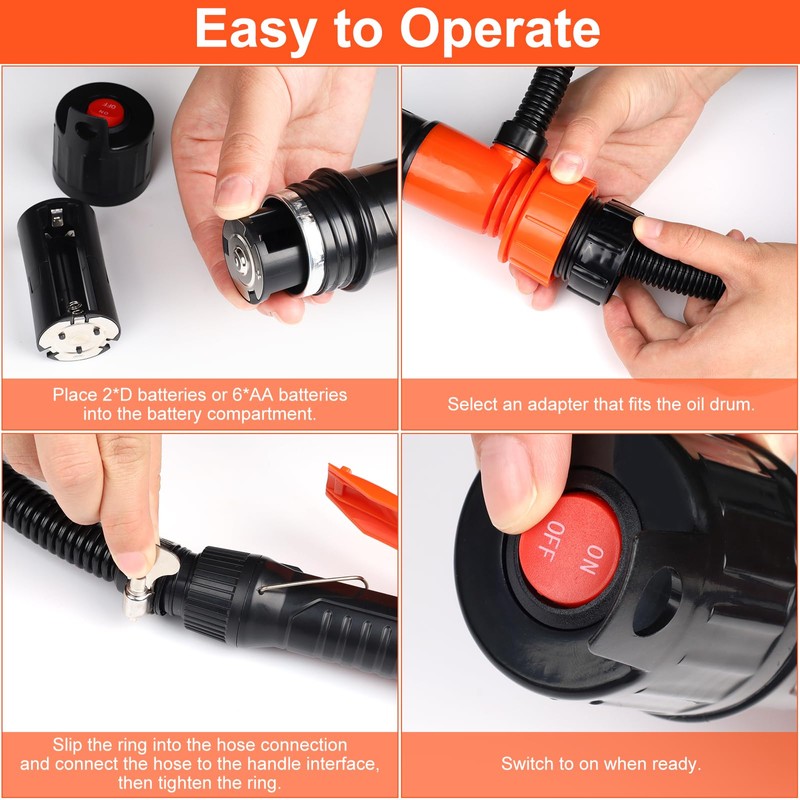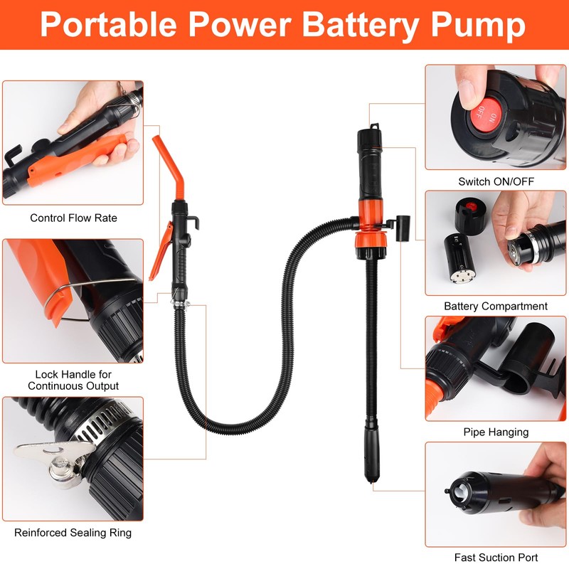 - Effortless Electric Pumping: Our liquid transfer pump makes liquid transfer a breeze. Perfect for gasoline, oil, water, and more, this fuel siphon pump saves you time and energy with its fast, hands-free operation. Requires 2 D Cell batteries or 6 AA batteries(not included).