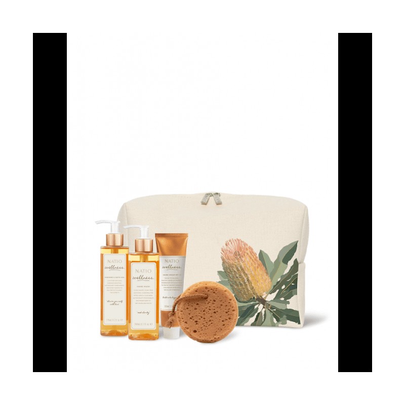 A golden trinity of Pomegranate-enriched goodness, these nourishing bodycare formulations give the gift of soft, smooth and glowing skin. ‘Glimmering Sun’ gift set includes a Wellness Shower & Bath Gel 275ml, Hand Wash 240ml, Hand Cream SPF 15 100ml and a complimentary bath sponge, presented in a complimentary Natio + Lamai Limited Edition cosmetic bag featuring native flora artwork by Australian digital artist, Lamai Anne.