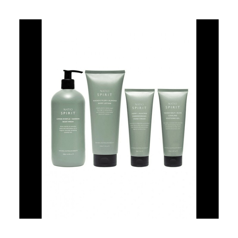 Natural Native Gum gift set contains a Spirit Lemon Myrtle Banksia Body Wash 500ml, Kakadu Plum Almond Body Lotion 210ml, Hemp Muntrie Hardworking Hand Cream 90g and Tassie Kelp Aloe Cooling Soothing Gel 100ml, presented in a large Natio tote bag.