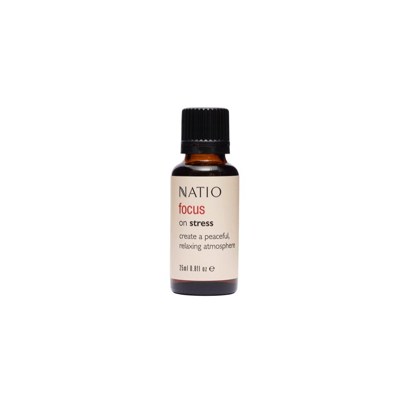 What are the benefits and features of Natio Focus On Stress Oil Blend 25ml?- Soothing blend of essential oils promotes relaxation and reduces stress.