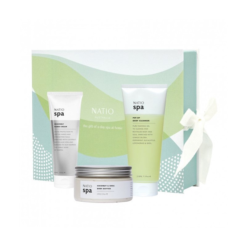 Tranquil Bay gift set contains a Spa Heavenly Hand Cream 90ml, Coconut & Shea Body Butter 240g and Pep-Up Body Cleanser 210ml, presented in a Natio keepsake box.