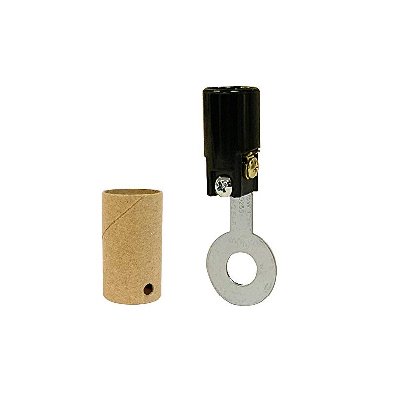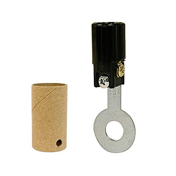 National Artcraft's candelabra base lamp socket has a flat bracket with a 7/16" round hole in the center. The bracket hole slips 1/8 IP so it will fit any standard lamp pipe or nipple or adapted for other types of fastenings. The bracket allows the socket to be mounted in virtually any position. A cardboard insulating sleeve is included to cover the socket. The socket is 1-1/8" long and the bracket is 1-3/8" long. Rated for up to a 75W bulb, the socket is both UL and CSA listed. Brass and silver colored screws make it easy to properly assemble your lamp cord to the socket. (Brass color screw goes to the smooth side of the cord). For indoor use only.