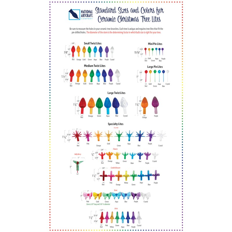 - National Artcraft offers these lites in six (6) different colors including: AQUA, BLUE, CRYSTAL CLEAR, GOLD, GREEN, RED and ASSORTED!