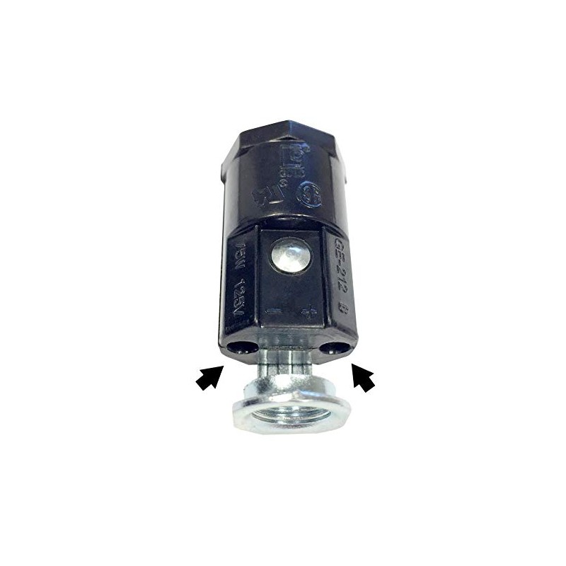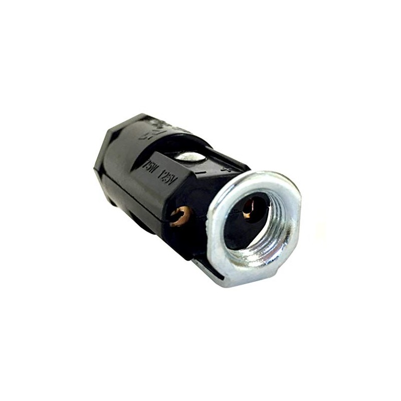 National Artcraft's quick-connect E12 candelabra base sockets do not have terminal screws like a traditional socket. Instead, they have two holes in the bottom of the socket through which you push the fully tinned ends of a standard lamp cord. The short bracket on the bottom of the socket allows for installation in small spaces. The bracket is threaded 1/8 IP, fitting any standard lamp pipe or nipple. This socket is rated for up to a 75W bulb and is both UL and CSA listed. For indoor use only.