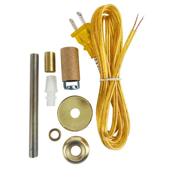 - This lamp kit includes an 8' transparent gold cord with plug, a candelabra size socket and all the matching hardware pieces necessary to electrify your lamp. (Bulb is not included)