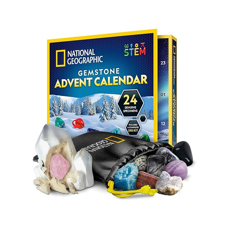 NATIONAL GEOGRAPHIC Gemstone Advent Calendar - 2024 Advent Calendar for Kids with 24 Gemstones to Open Each Day, a Complete Rock Collection Christmas Countdown Calendar with Mini Gemstone Dig Kit