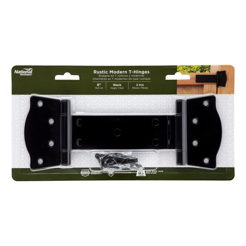 • The National Hardware Rustic Modern Gate T-hinges are a set of two T-Hinges that are durable, dependable and designed for long-lasting everyday use.