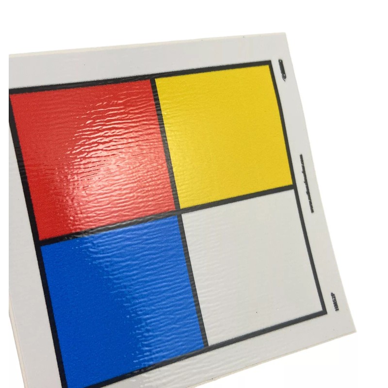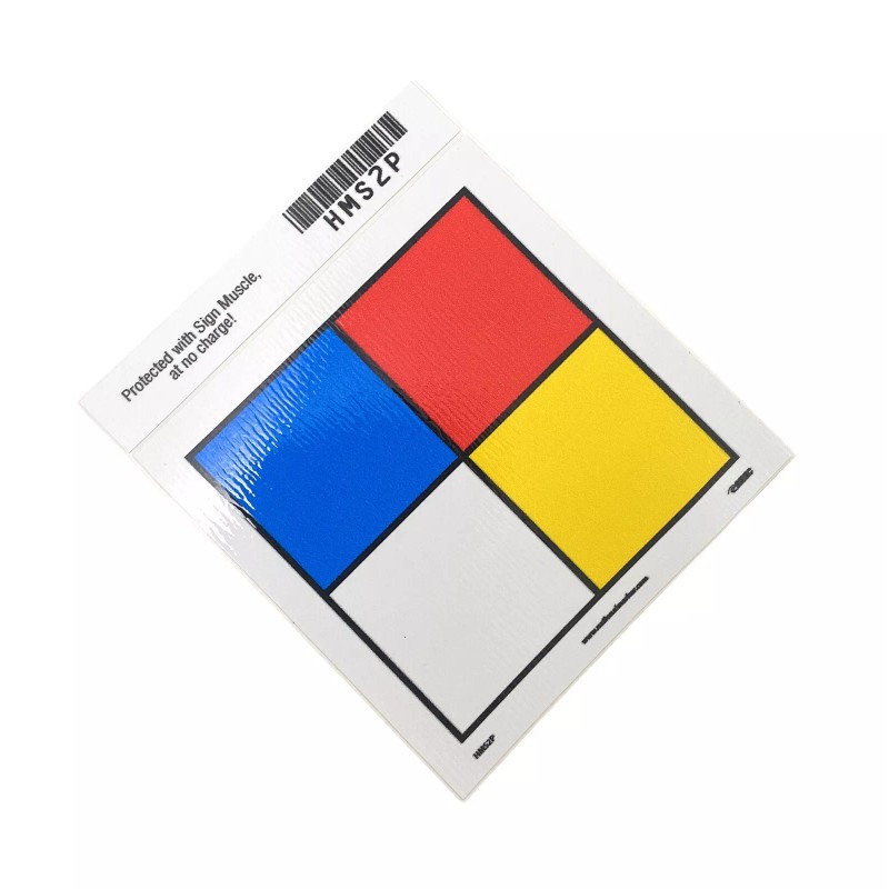 Specifications: the square vinyl label is 3.125 in. wide and high, and 0.004 in. thick, and has red, blue, white, and yellow colors. It is available in a roll of 5 pieces