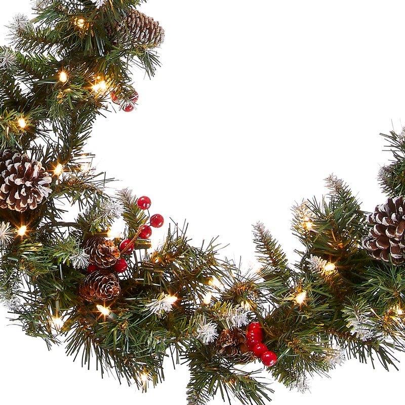 - Designed with a Frosted Berry branch base, this pre-lit artificial Christmas garland is 9 feet long and decorated with pine cones and berry clusters.