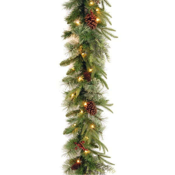 - Designed with a Colonial Fir branch base, this pre-lit artificial christmas garland is 9 feet long and decorated with pine cones. Lights change from warm white to multicolor