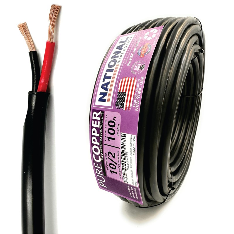 NATIONAL Wire&Cable - 10 Gauge 2 Conductors Premium Electrical Wire - Made in USA - 10 AWG Wire Stranded PVC Cord Power Copper Cable 100 Ft. Indoor and Outdoor Lighting Automotive Battery