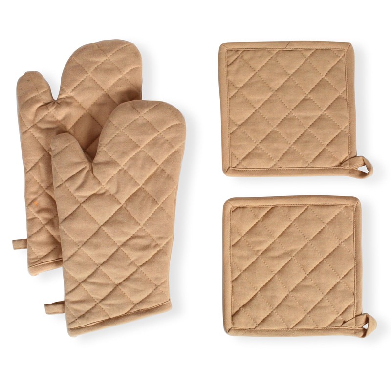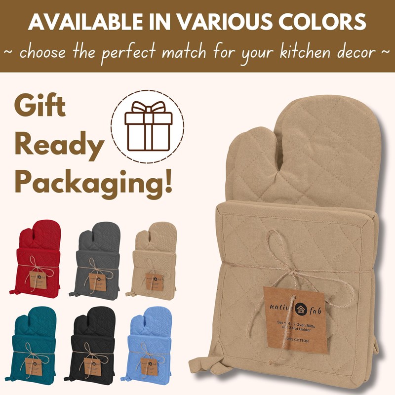 Native Fab Pot Holders and Oven Mitts Sets for Kitchen Heat Resistant- Hanging Non-Slip - 100% Cotton Oven Mitts and Pot Holders 4-Piece Set- Beige