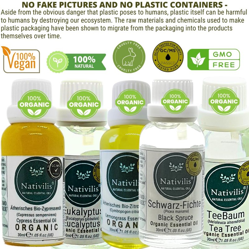 - PREMIUM SET: Collection of 5 pure organic essential oils including Eucalyptus, Lemongrass, Tea Tree, Cypress & Black Spruce , each in a generous 30ml bottle