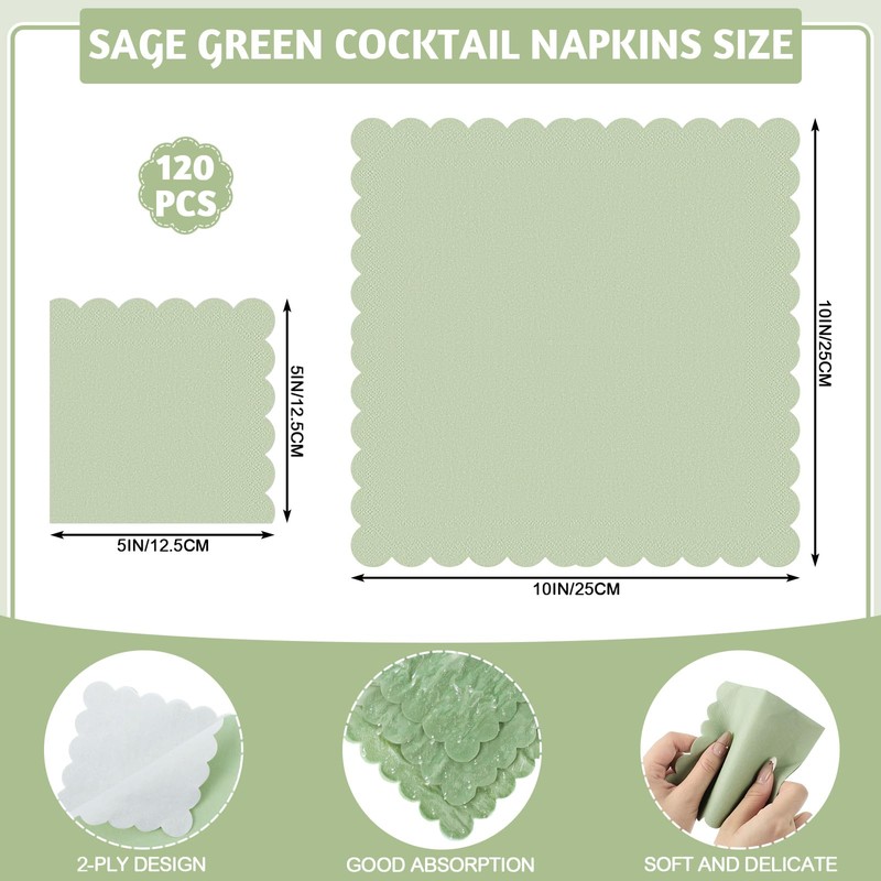 - 【Package Includes】You will get 120 sheets sage green scalloped napkins, which are enough for your daily life or party time use. Sage green napkins disposable suitable for decorating dessert plates, cocktail, beverage and dinner party.