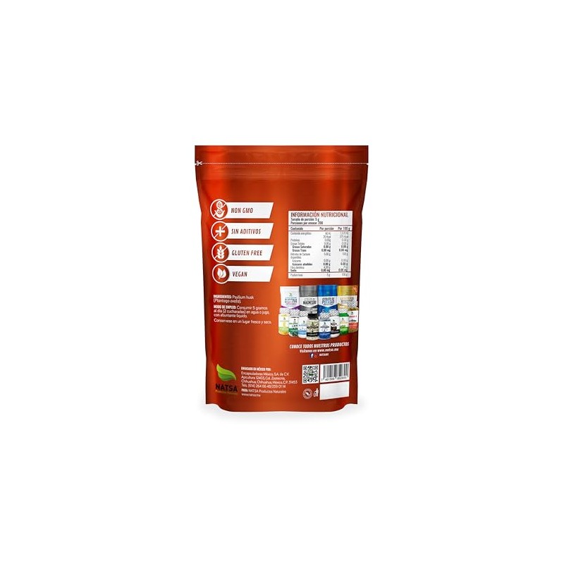 NATSA Psyllium Plantago Premium es un suplemento de fibra 100% natural en formato polvo. Cada porción de 5 g (aprox. 2 cucharadas) aporta fibra soluble de alta pureza que favorece el tránsito intestinal, ayuda a controlar el apetito y promueve la salud digestiva. Ideal para dietas cetogénicas, vegetarianas o de control de peso. Fabricado en instalaciones registradas por la FDA, garantiza calidad y seguridad.