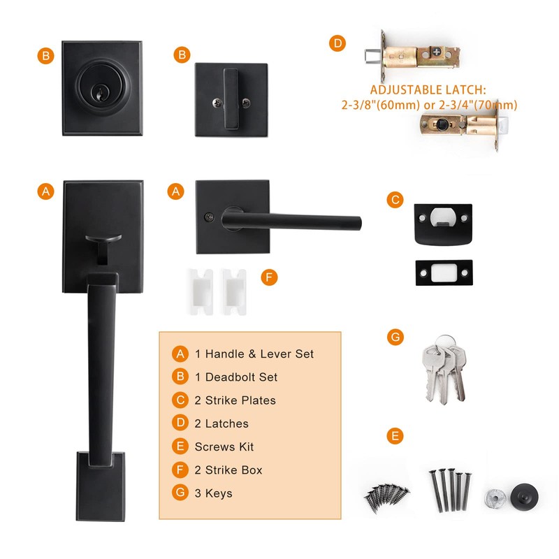 - 【DURABLE AND RUST-PROOF】The front entry door handle set features zinc alloy construction with a matte black finish. ANSI Grade 3 standard, our door handle and deadbolt are designed and tested with strength and durability in mind.